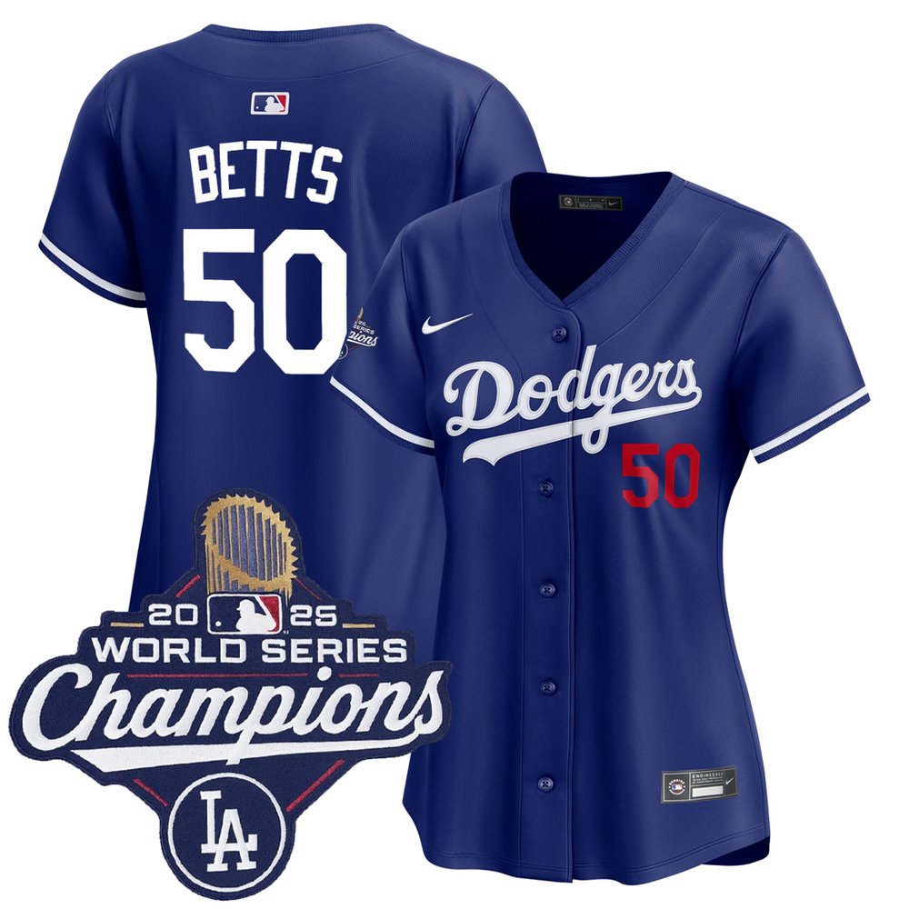 Women's Los Angeles Dodgers #50 Mookie Betts Nike Royal 2025 World Series Champions Home Limited Jersey